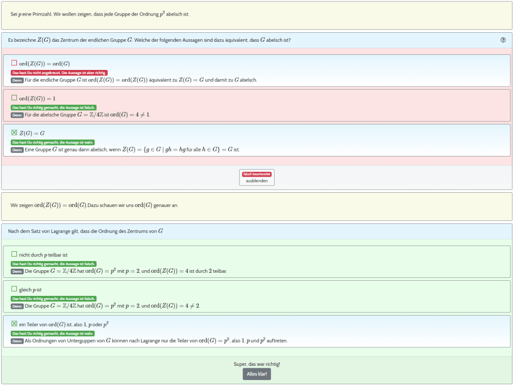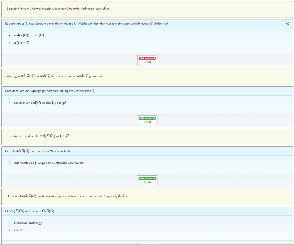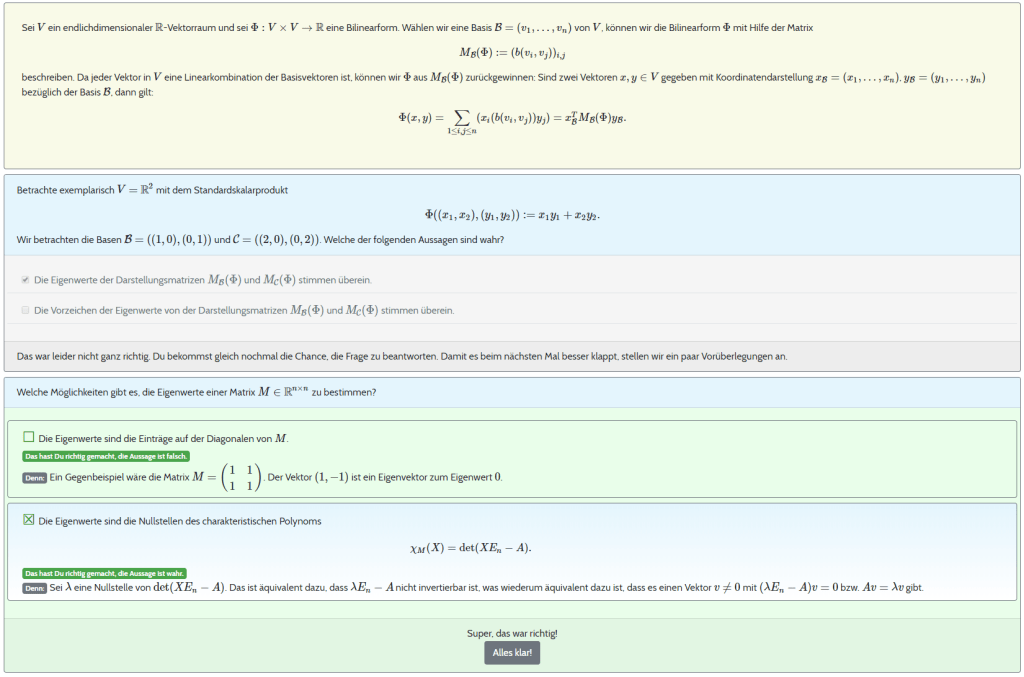Unser Quizsystem KeKs ist ein bisschen in die Jahre gekommen und außerdem nicht komplett in MaMpf integriert. Deshalb arbeiten wir seit einiger Zeit an einer Neuauflage: BananE. Dabei wollen wir die Funktionalität weitreichend verallgemeinern. BananE („Beweise angeleitet ausführen und nachvollziehen zur Erkenntnisvertiefung“) wird dir die Möglichkeit geben, Beweise im Stil eines Textadventures zu führen. Dabei bekommst du Feedback für jeden deiner Schritte. Wenn BananE erstmal in MaMpf eingebaut ist, wird die BananE-Engine auch KeKs betreiben. Aktuell probieren wir einen BananE-Prototypen im Seminar „Quadratische Formen“ aus. Wir hoffen, dass wir demnächst so weit sind, dass wir BananE für alle freigeben können. Damit du dir ein Bild machen kannst, was dich bei BananE erwartet, sind hier ein paar Screenshots.