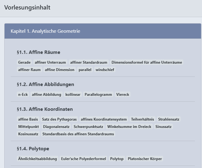 Wie funktioniert das Ganze? Wir haben ein LaTeX-Paket für MaMpf entwickelt. Dieses exportiert Metadaten ins Skript-pdf, die MaMpf ausliest und dann verwenden kann, um etwa die Vorlesungsgliederung, Inhaltsübersichten von Vorlesungssitzungen oder Tags zu erstellen. So wird aus einem pdf-File ganz schnell das hier: