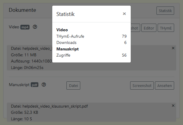 Bei Dokumenten und Videos sehen Editor*innen die Anzahl der Aufrufe und Downloads, bei Quizzes die Anzahl der richtig beantworteten Fragen. Dabei werden allerdings nur vollständig bearbeitete Quizzes berücksichtigt. Bei einzelnen Quizfragen wird das Verhältnis der richtigen und falschen Antworten angezeigt.