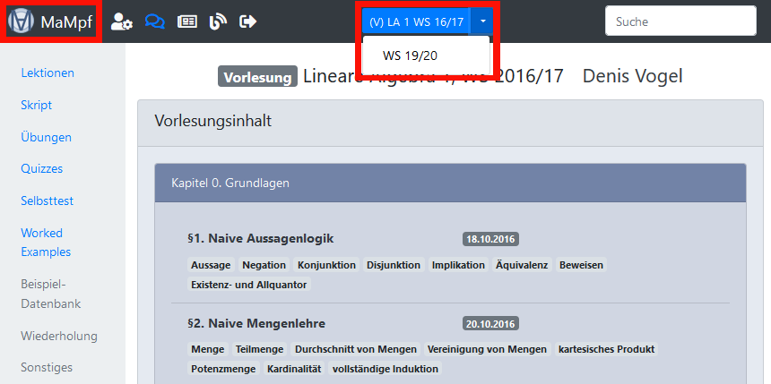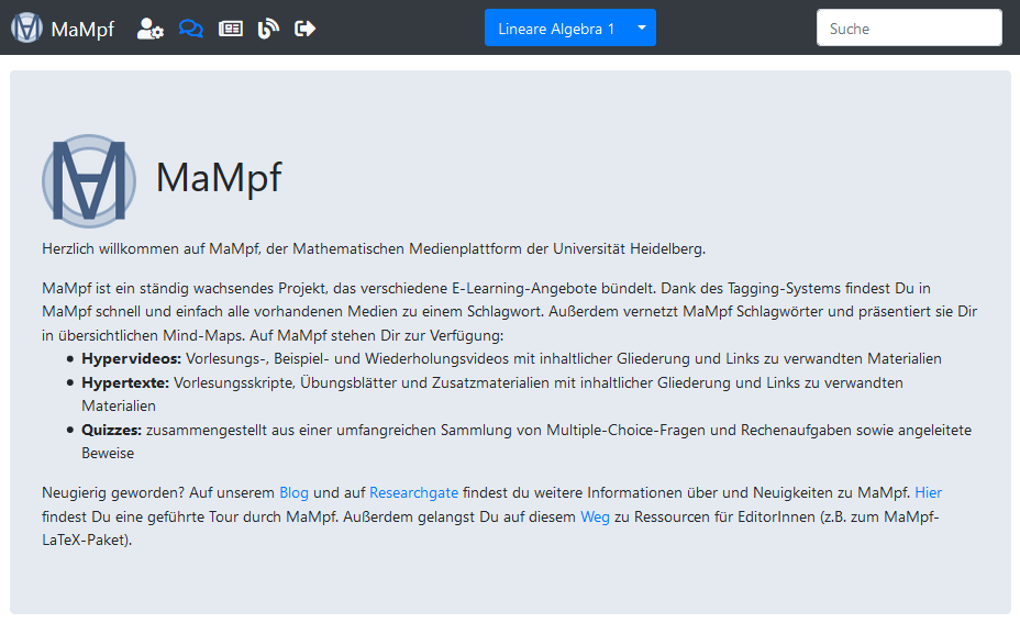 Dreh- und Angelpunkt der Navigation zwischen Veranstaltungen ist die neue Startseite. Zu ihr gelangt man, indem man auf das MaMpf-Logo (oben rechts) klickt. Um in eine andere Veranstaltung zu wechseln, muss man zunächst über das MaMpf-Logo auf die Startseite gehen und dort die gewünschte Veranstaltung anklicken. Damit übernimmt die Startseite die bisherige Navigationsfunktion des blauen Drop-Down-Menüs (oben Mitte).