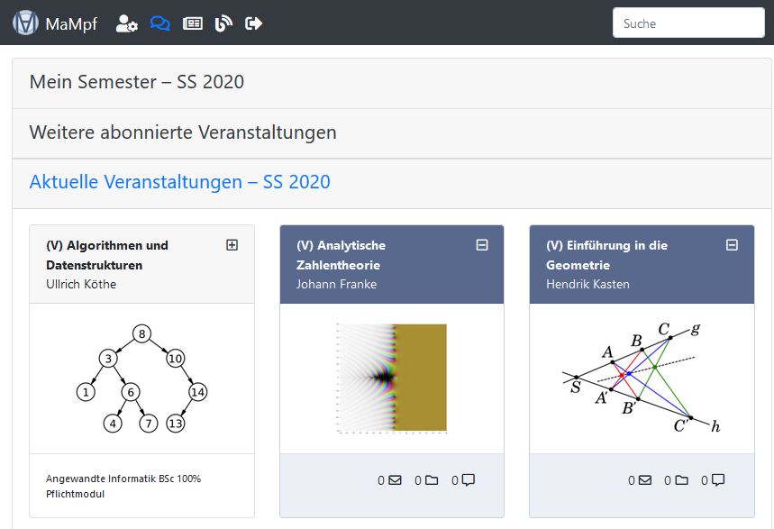 Die auf MaMpf verfügbaren Veranstaltungen werden auf der neuen Startseite in drei Kategorien präsentiert: Mein Semester, Weitere abonnierte Veranstaltungen und Aktuelle Veranstaltungen. Durch Klicken auf den Veranstaltungstitel oder das Thumbnail navigiert man zur gewünschten Veranstaltung. Zudem gibt es nun auch eine Suchfunktion für Veranstaltungen.