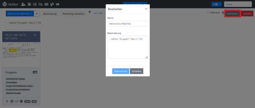 - Eine Liste bearbeiten, indem du auf den „Bearbeiten“-Button oben rechts klickst. Nun kannst du die Liste umbenennen oder den Beschreibungstext verfassen bzw. überarbeiten. Bestätige deine Änderungen, indem du auf „Übernehmen“ klickst. Der Text zu deiner Liste wird übrigens ein- bzw. ausgeblendet, wenn du auf „Beschreibung“ klickst.