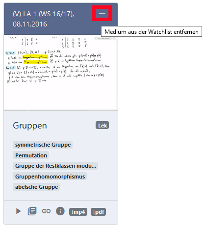 - Medien von einer Liste löschen, indem du auf das Minusicon oben rechts auf der Mediacard klickst.