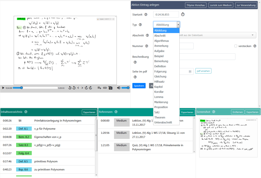 - Aufschriebe und Videos können überarbeitet sowie nach- und aufbereitet werden. Dadurch ist das Einfügen von Verweisen und eine enge Verzahnung mit weiteren Lernangeboten wie Quizzes oder Word-Example-Videos möglich. Mit wenigen Klicks können Aufschriebe und Videos exportiert und über MaMpf Studierenden zugänglich gemacht werden. Von diesen Vorlesungsmitschrieben profitieren Studierende, denen das simultane Mitdenken und Mitschreiben Schwierigkeiten bereitet, enorm, da sie zugunsten des Mitdenkens auf das Mitschreiben verzichten und trotzdem auf einen Vorlesungsmitschrieb als Arbeits- und Lerngrundlage zurückgreifen können.