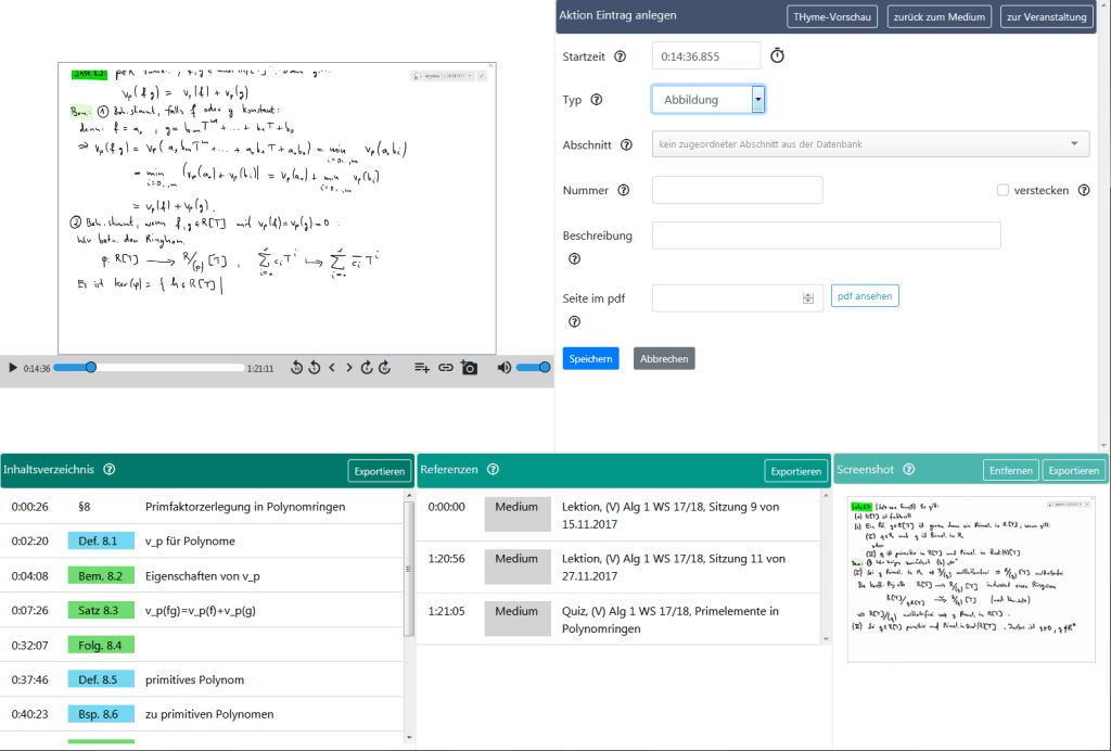 Zunächst wird das in Camtasia aufgezeichnete Vorlesungsvideo geschnitten. Dabei können Korrekturen und Überarbeitungen vorgenommen werden, zum Beispiel falls in der Vorlesung kleinere Fehler passiert sind. Dann wird das bearbeitete Video als mp4-Datei exportiert. Je nach Bearbeitungsbedarf nimmt dies ingesamt etwa 30 Minuten bis eine Stunde in Anspruch. Anschließend wird das Video auf MaMpf hochgeladen, wo es im THymE-Editor getaggt wird. Der Zeitaufwand des Taggings hängt von der Anzahl der gesetzten Tags und Referenzen ab. Durchschnittlich werden etwa 15 Minuten benötigt.