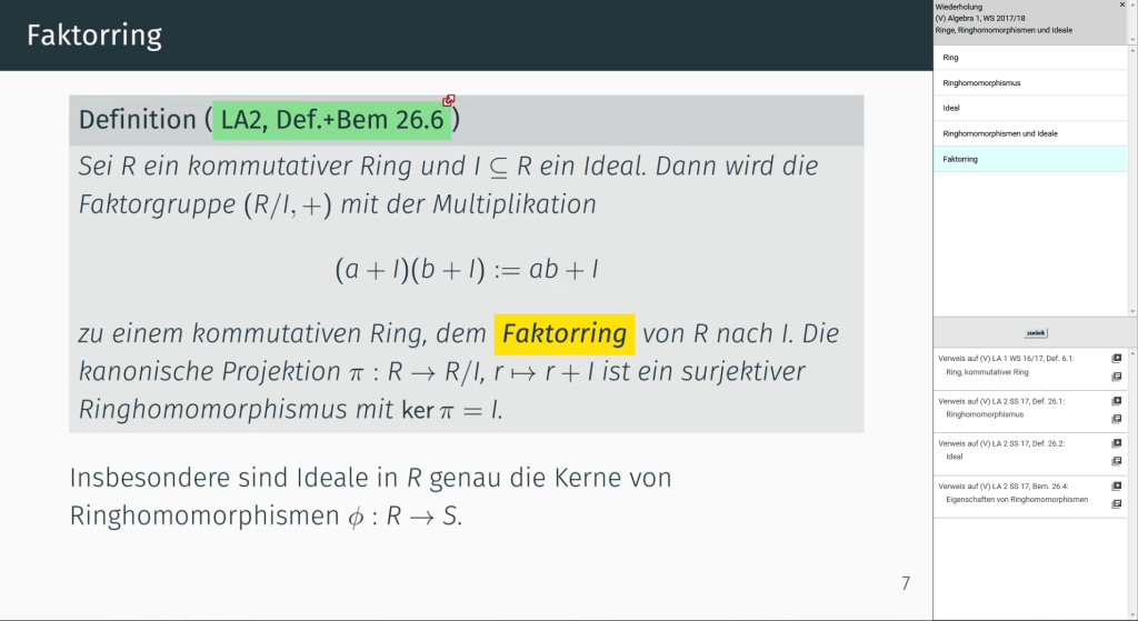 Mathematische Theorie ist hochkomplex, sie definiert und beschreibt eine Vielzahl an Objekten und deren vielschichtige Beziehungen. Um ihr folgen und sie begreifen zu können, ist breites (Vor-)Wissen erforderlich. In diesem unterscheiden sich Studierende aus verschiedenen Gründen teils deutlich. Besonders in fortgeschrittenen Vorlesungen können Wissensdefizite dem Verständnis und dem Nachvollziehen der in der Vorlesung präsentierten Theorie im Weg stehen. Lehrende sehen sich dadurch vor die Entscheidung gestellt, ob sie für die Vorlesung relevante Inhalte wiederholen oder nicht. Keine dieser beiden Optionen stellt jedoch eine befriedigende Lösung dar.