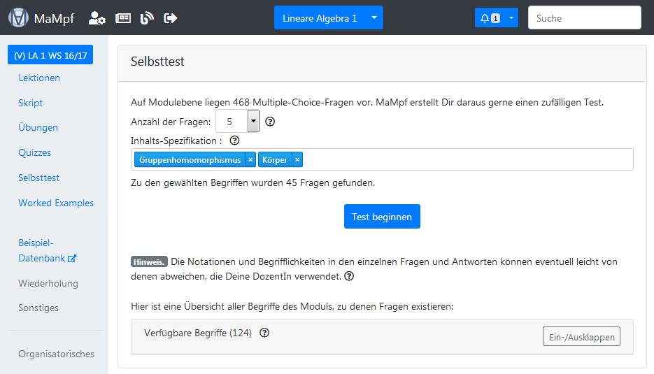 KeKs bietet dir dazu zwei verschiedene Arten von Quizzes: auf den aktuellen Vorlesungsstoff abgestimmte („Quizzes“) und zufällig generierte („Selbsttest“).