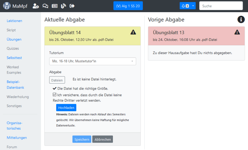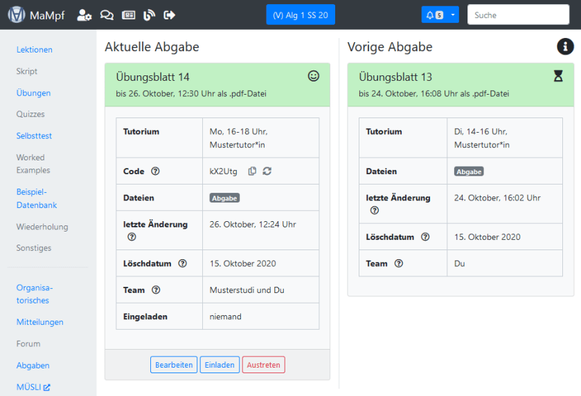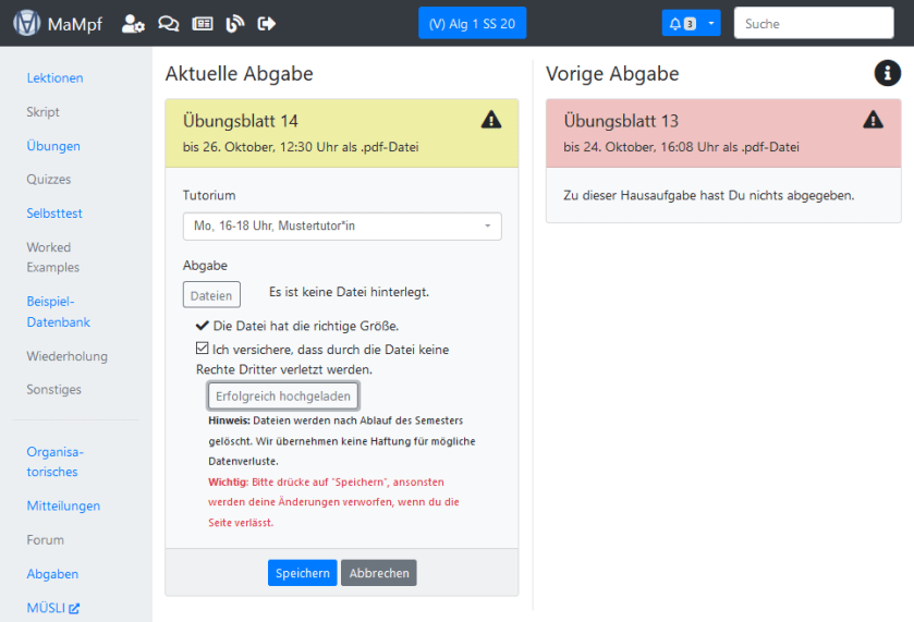 - Dateien löschen und ersetzen: Wenn die Abgabedatei von einem Teammitglied gelöscht oder ersetzt worden ist, kann MaMpf die ursprüngliche Datei nicht wiederherstellen. Bedenke dies, wenn du die Abgabe bearbeitest.