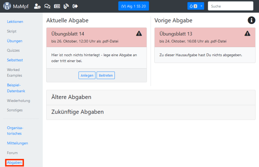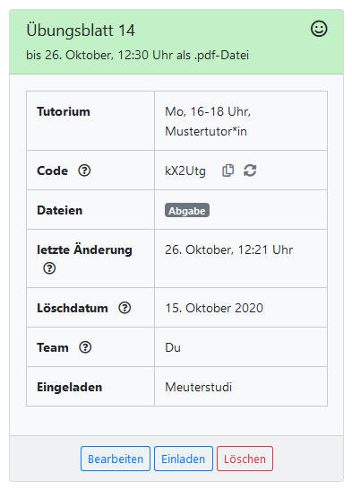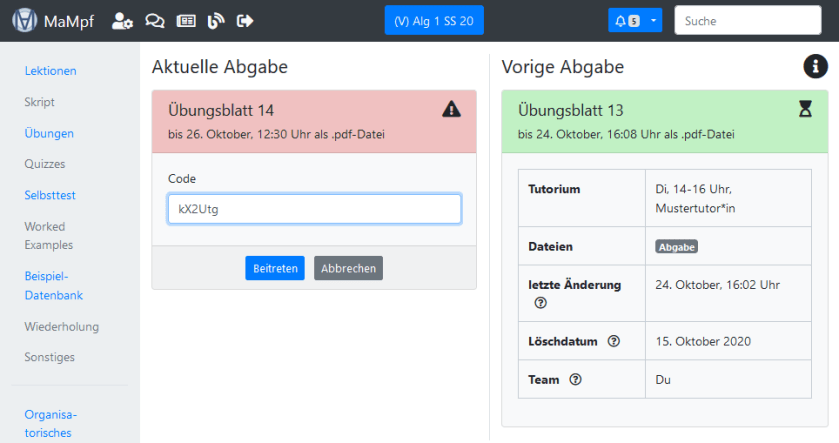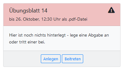- rot: Entweder gehörst du zu keinem Abgabeteam oder deine verspätete Abgabe wurde nicht angenommen. Lege im ersten Fall eine Abgabe an oder tritt einer bei. Um einer Abgabe beizutreten, musst du den Einladungscode eingeben. Lass dir diesen von der Person, die die Abgabe erstellt hat, zuschicken. Falls ihr schon einmal zusammen abgegeben habt, kann dich diese Person einladen, woraufhin du eine E-Mail mit einem Beitrittslink erhältst.