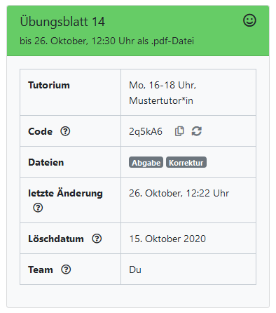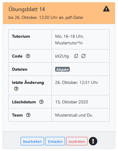 - orange: Jemand in deinem Team hat eure Abgabe nach Ablauf der Abgabefrist verändert. Es liegt nun an eurem Tutor oder eurer Tutorin zu entschieden, ob eure Lösung gewertet wird oder nicht.