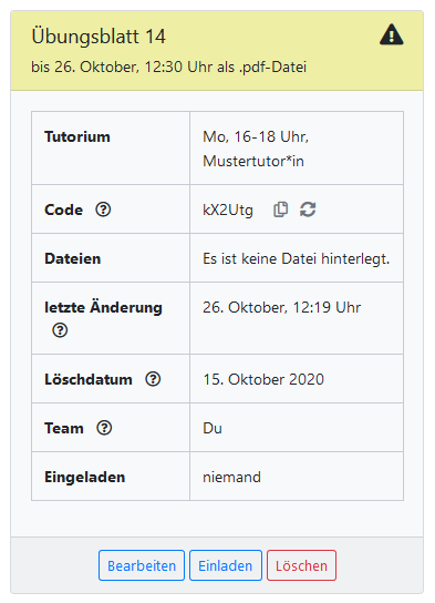 - gelb: Du gehörst zu einem Abgabeteam, aber ihr habt noch keine Datei abgegeben. Lade eure Lösung hoch.