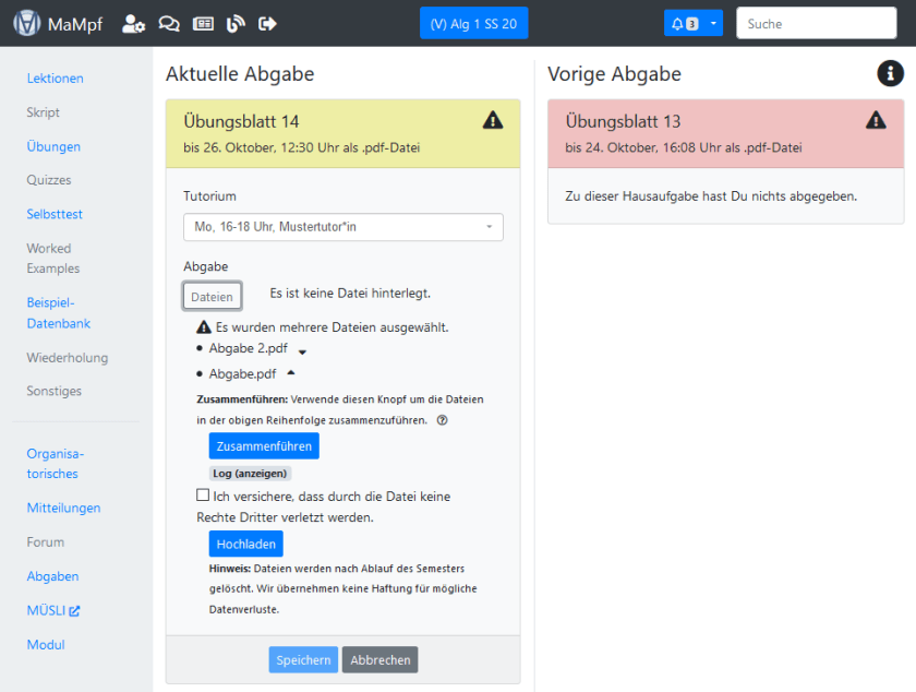 - Zusammenführen von Dateien: MaMpf kann Dateien in einer von dir festgelegten Reihenfolge zusammenführen. Wähle dazu mehrere Dateien aus, passe die Reihenfolge an und lade sie hoch. Wenn du zu einer bereits hochgeladenen Datei eine weitere Datei hinzufügen möchtest, musst du die bereits hochgeladenen Datei runterladen und anschließend zusammen mit der beizufügenden Datei hochladen. Andernfalls wird die bereits hochgeladene Datei überschrieben. Die Überschreibung kann nicht rückgängig gemacht werden.