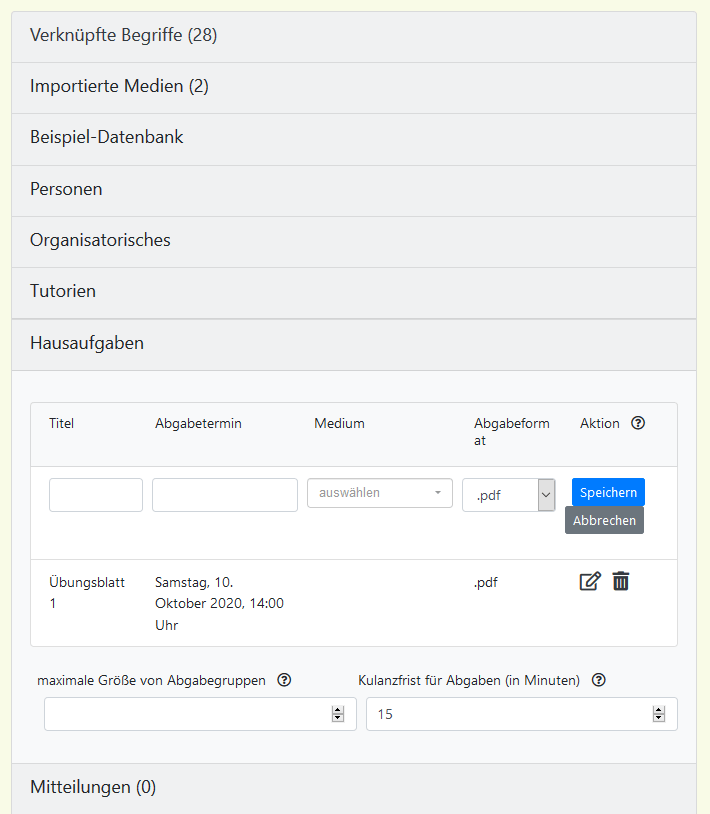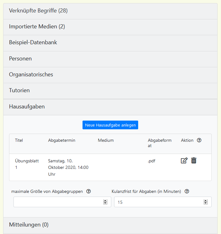 Hausaufgaben werden ebenfalls auf der Seite „Veranstaltung bearbeiten“ angelegt. Im Akkordeon klickt man dazu auf „Hausaufgaben“. Dort kann eine maximale Größe für Abgabegruppen ausgewählt werden. Diese Beschränkung gilt nur für Abgaben, die nach der Änderung des Limits angelegt werden. Außerdem kann man eine Kulanzfrist einstellen. Diese Frist beginnt nach der Deadline für ein Übungsblatt. Bevor diese Frist abgelaufen ist, können Studierende noch Änderungen an ihrer Abgabe vornehmen. Die Abgabe wird dann allerdings als verspätet eingestuft und kann von Tutor*innen abgelehnt werden.