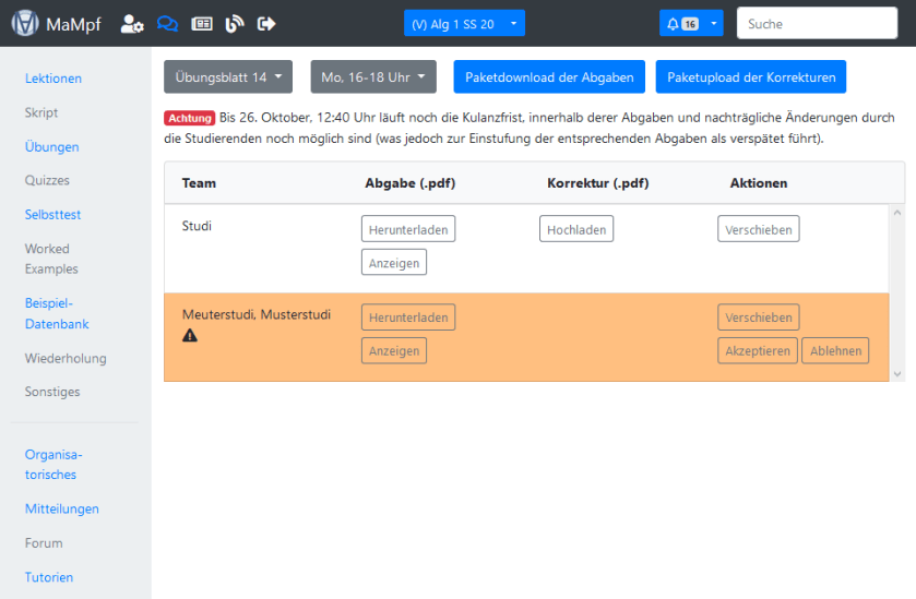 Über MaMpf können Übungsblätter abgegeben und zurückgegeben werden. Im Folgenden wird beschrieben, welche Möglichkeiten es bei der Zettelabgabe über MaMpf gibt und wie sie von Vorlesungsassistent*innen oder Dozent*innen eingerichtet werden kann. Assistent*innen, die selbst Übungsgruppe leiten, finden hier weitere Informationen zur Korrektur und Rückgabe von Übungsaufgaben.
