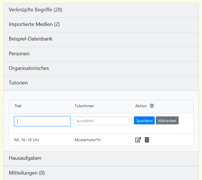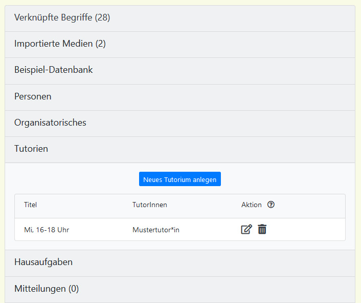 Tutorien werden auf der Seite „Veranstaltung bearbeiten“ eingerichtet. Im Akkordeon klickt man dazu auf „Tutorien“. Nun kann mithilfe des Buttons „Neues Tutorium anlegen“ ein Tutorium angelegt werden. Um einem/r Tutor*in eine Übungsgruppe zuzuweisen, muss diese/r sich bereits auf MaMpf registriert haben. Ist dies noch nicht geschehen, kann das Feld „Tutor*in“ frei gelassen und nachträglich bearbeitet werden. Abgaben in Tutorien ohne Tutor*in sind möglich, auf sie kann aber niemand zugreifen. Es ist sowohl möglich, einer Übungsgruppe mehrere Tutor*innen zuzuweisen, als auch einem/r Tutor*in mehrere Übungsgruppen. Die Felder „Titel“ und „Tutor*in“ können jederzeit bearbeitet werden. Tutorien können nicht mehr gelöscht werden, sobald es Abgaben in ihnen gibt.
