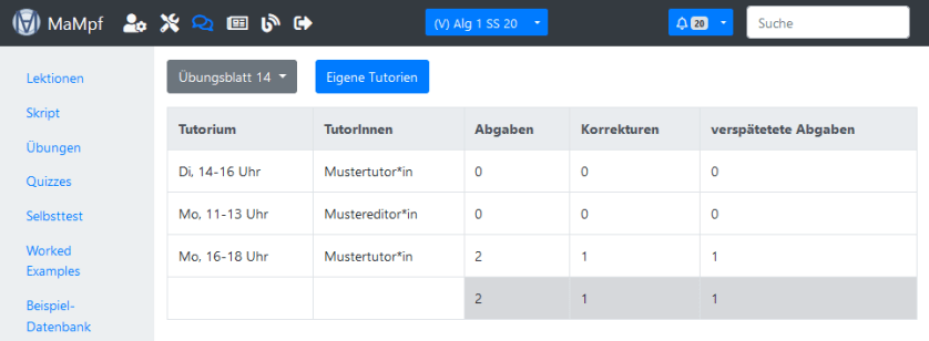 Die Überblicksseite über die Tutorien erreicht man, indem man in der entsprechenden Veranstaltung auf „Tutorien“ in der Sidebar auf der linken Seite klickt. Dort befindet sich eine Übersicht über die Anzahl der (verspäteten) Abgaben und Korrekturen. Diese Übersicht steht nur Editor*innen zur Verfügung. Tutor*innen können über diese Seite nur die Abgaben ihrer Übungsgruppen herunterladen und die Korrekturen zu diesen hochladen. Editor*innen, die gleichzeitig auch Tutor*innen sind, können zudem mithilfe des entsprechenden Buttons zu ihren eigenen Übungsgruppen wechseln.